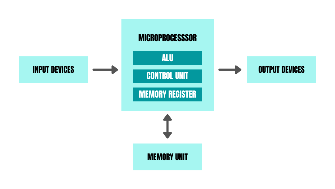 Microprocessor basically takes instructions in the form of binary as input, processes the data, and gives output accordingly. The Microprocessor has three main parts: ALU, Control unit, and Memory Registers. The ALU takes care of all arithmetic and logic operations like addition, subtraction, AND, OR, XOR, etc. Control units fetch one instruction at a time from the main memory and then execute it. Memory registers are a series of registers like accumulator (A), B, C, D, etc., which act as temporary fast access memory locations for processing data.