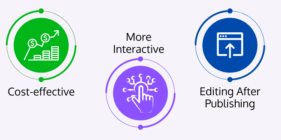 - Cost-effective: Since digital publishing eliminates many processes involved in traditional publishing, like printing charges, distribution costs, and all the many people involved, it's typically much cheaper.