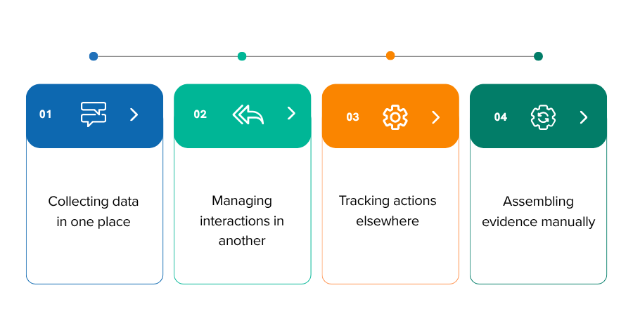 A customer inquiry might be received through a form. A follow-up happens over email or messaging. Documents are shared separately. Payments are tracked elsewhere. None of these steps is inherently non-compliant, but they are not connected.