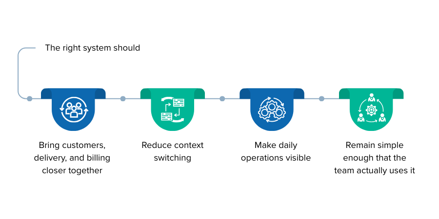 Start by mapping what already exists. List the tools currently in use. Identify where customer data lives. Identify where billing is tracked. Notice where duplication occurs. Often, the biggest gains come not from adding something new, but from aligning what is already there.