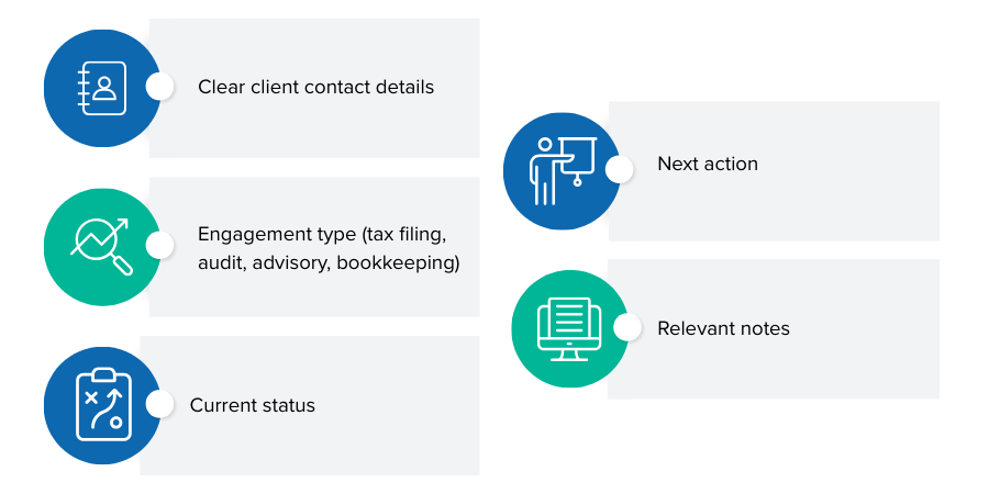 - Engagement type (tax filing, audit, advisory, bookkeeping)