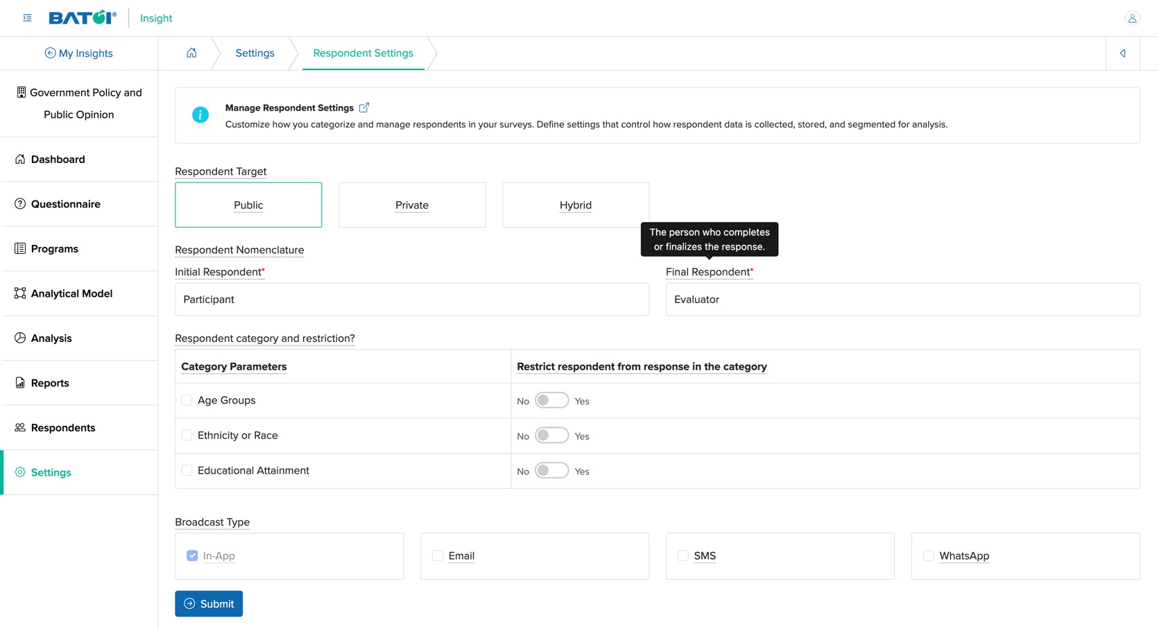 You can enter the details below and click the Submit button to save the Respondent Settings, as shown in Figure 12 above. The details that need to be filled in are: